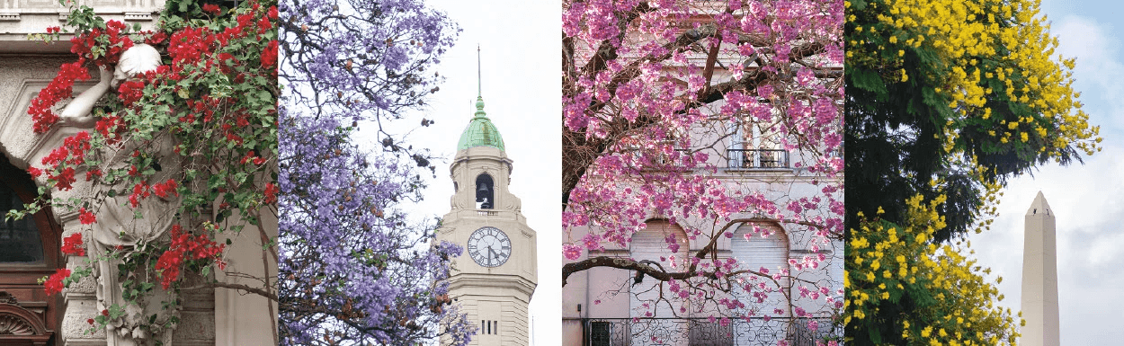 De esta forma, aprenderemos, entre otras cosas, que el rosado de la paleta porteña lo brindan los lapachos, que el ceibo y las Santa Rita nos regalan los rojos, que los palos borrachos y jazmines aportan una cuota de blanco, las tipas y el ibirá pitá un amarillo festivo y el jacarandá esa pátina violeta que representa tan bien la nostalgia porteña.