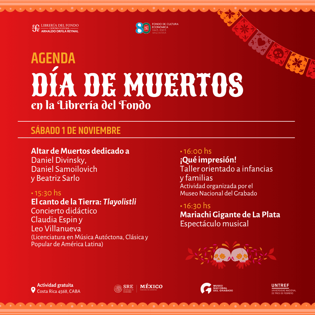 El Fondo de Cultura Económica invita a compartir esta tradicional celebración mexicana el sábado 1° de noviembre, en la Librería del Fondo y Centro Cultural "Arnaldo Orfila Reynal" (Costa Rica 4568, CABA), con actividades de entrada libre y gratuita para todas las edades (no se suspende por lluvia).