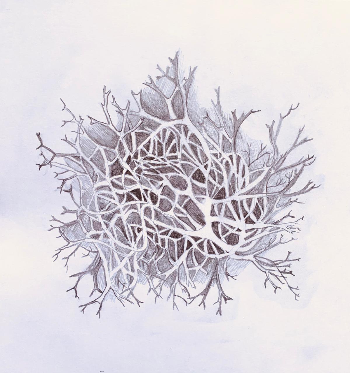 Durante mis caminatas diarias de investigación y vinculación con el entorno, recolecté cortezas, líquenes, hongos, hojas y ramas. Estos fragmentos materiales marcaron mi experiencia y mi trabajo de taller con papeles, cortes y dibujos .