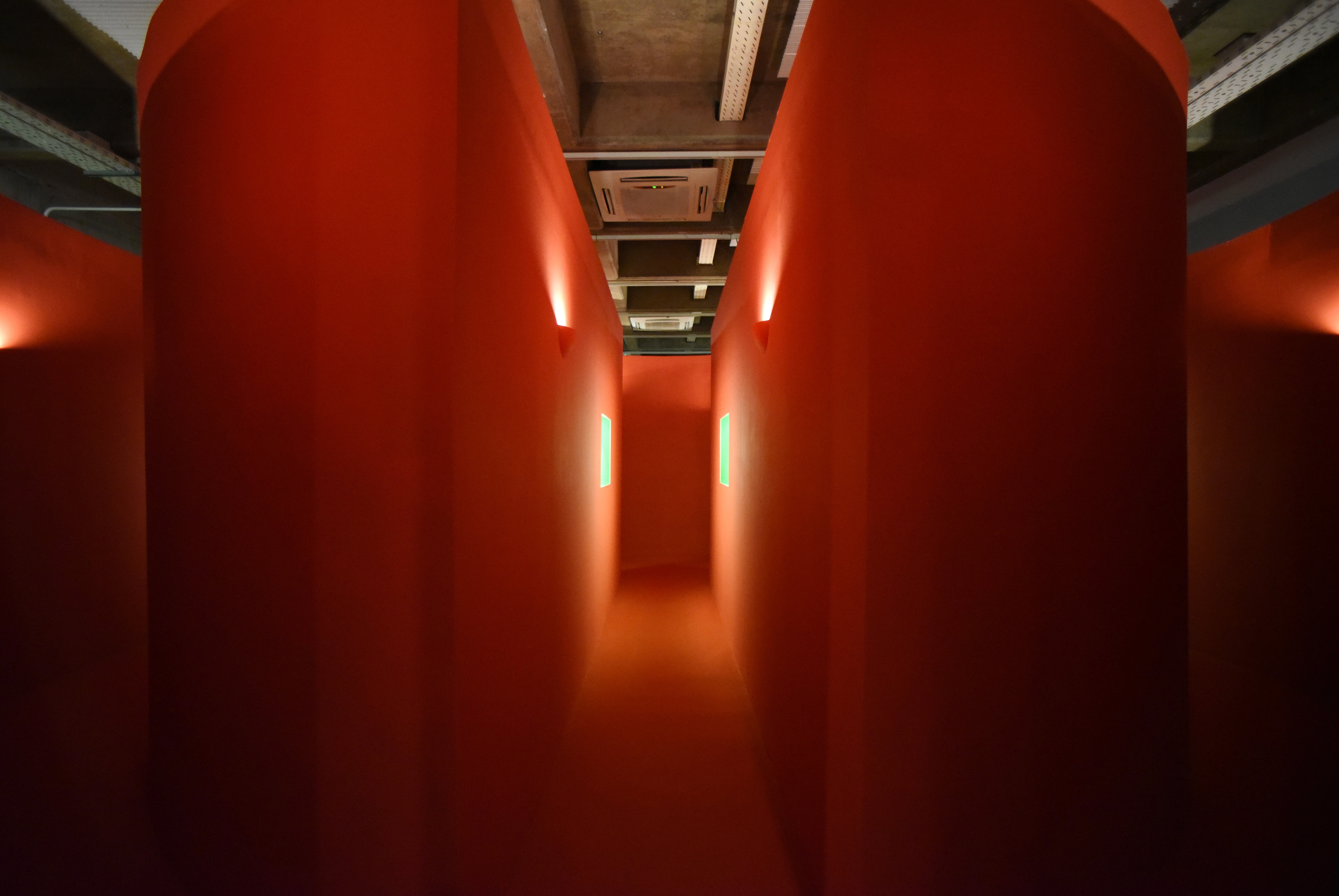 A partir de este modelo conceptual, Ballesteros desarrolla una instalación inmersiva compuesta por pasillos sinuosos que conducen al visitante a una experiencia de recorrido no lineal. A lo largo del trayecto, una serie de pequeñas ventanas permiten observar dibujos que aparecen fragmentados, parciales, siempre mediados por la arquitectura del propio dispositivo. La circulación propuesta replica el loop extraño que define a la botella de Klein: un desplazamiento continuo que no conduce a un punto de salida claro y que pone en tensión las nociones tradicionales de recorrido y orientación.
