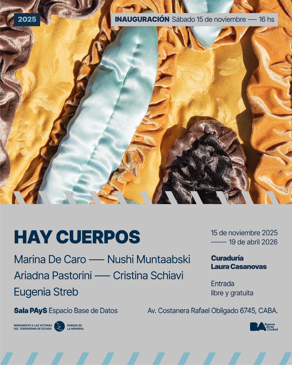 La exhibición Hay cuerpos, con curaduría de Laura Casanovas, es una de las propuestas que será parte de la de la Sala PAyS. Hay cuerpos indaga sobre las distintas posibilidades de existencia de los cuerpos, al mismo tiempo que busca desandar la construcción cultural de algunas asociaciones de significados para intentar aperturas y diálogos en un mundo que suele desestimarlos. ¿Cómo son esos cuerpos?, ¿Qué atraviesan, padecen, postulan?, ¿resisten?, ¿proponen?, ¿Cómo se presentan y representan? La preeminencia de curvas y del textil, al cual se suman la cerámica, el dibujo y el video, amplifican percepciones. Los cuerpos se contorsionan, agrupan, fragmentan, aíslan, levantan. Y son coloridos planteándose otra modificación respecto de la relación frecuente entre cromatismo/júbilo y oscuridad/dolor.