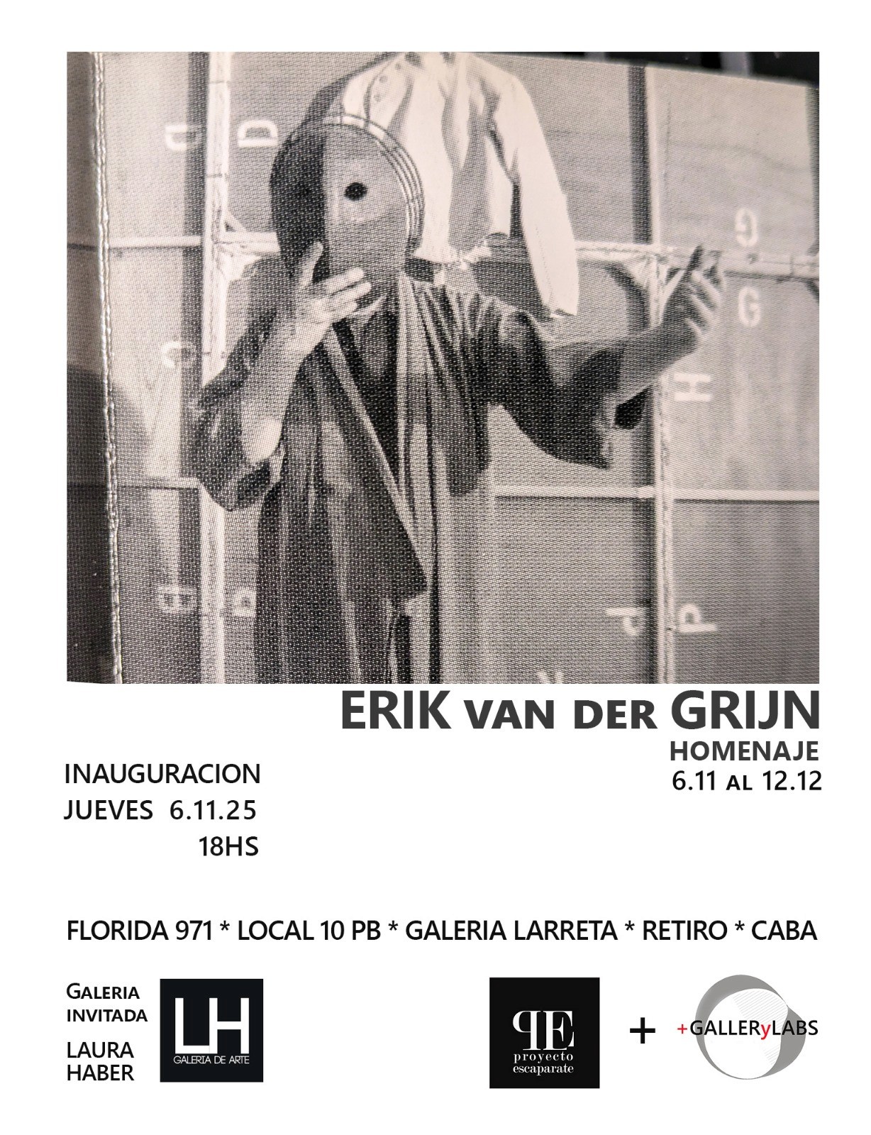 Proyecto Escaparate + GALLERyLABS tienen el placer de invitarte a la inauguración de la muestra homenaje a ERIK van der Grijn (1942 - 2022) presentada por Galería LAURA HABER, como galería invitada. La inauguración tendrá lugar el jueves 6 de noviembre a partir de 17hs..Te esperamos en Florida 971, Local 10. PB. Galería Larreta. Retiro..Erik van der Grijn es un artista plástico formado en la Real Escuela de La Haya, cuya obra se caracteriza por su monumentalidad y su profunda carga social. Vivió y trabajó en diversos países de Europa antes de establecerse entre Nueva York y Buenos Aires desde 1995. Su producción, influenciada por el arte concreto, el minimalismo y el arte conceptual, combina rigor formal y compromiso ético..Erik van der Grijn utiliza grandes superficies —muros y amplias telas— para expresar su protesta frente a la injusticia y reflexionar sobre tensiones universales como la dominación, el peligro y el conflicto. Con una paleta dominada por amarillos y negros, y ocasionalmente rojos y azules vibrantes, busca transmitir tanto la crítica como la esperanza..Desde sus inicios, cuando era conocido como “Yellow Fellow” por su “realismo de bordes duros”, ha explorado la relación entre ritmo visual y musicalidad, comparando sus composiciones con fugas de Bach. A lo largo de su trayectoria, transitó del rigor geométrico al expresionismo abstracto, manteniendo siempre una preocupación constante por los problemas sociales y una inclinación por las obras de gran escala que impactan por su fuerza y contundencia.