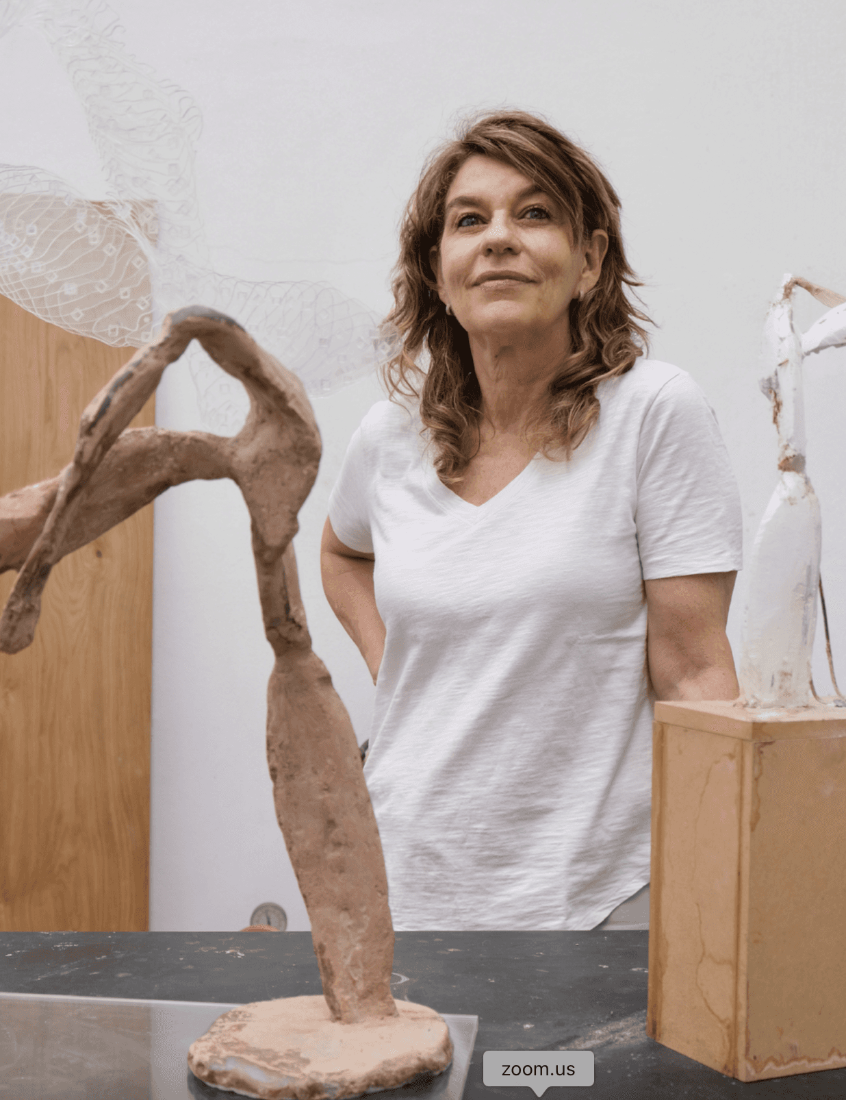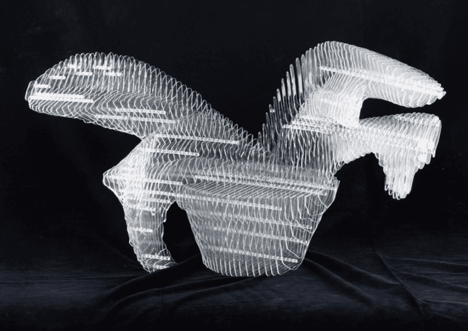 El dibujo, el modelado en arcilla, el renderizado, la impresión y el ensamblaje son todas fases de un proceso de investigación sobre la composición de los elementos en el espacio. A través de una profunda indagación en el volumen y una diversidad de lenguajes, la artista desdobla una misma figura en múltiples imágenes posibles. Esta comprensión del plano le permite acentuar las tensiones y direcciones espaciales, lo que logra dotar de un gran dinamismo y un frágil estado de equilibrio a sus esculturas. Estas formas llevan al límite los materiales y su estabilidad, las piezas permanecen en tensión y desafían la gravedad. (Fragmento del texto curatorial).