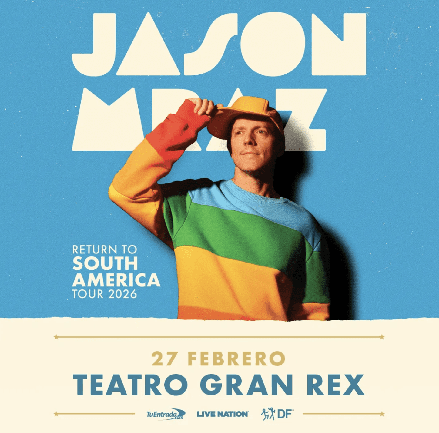 Jason Mraz vuelve a la Argentina tras 10 años! El reconocido cantante y compositor estadounidense, multipremiado con GRAMMYs y referente indiscutido del pop contemporáneo, se presentará el 27 de febrero de 2026 en el Teatro Gran Rex, como parte de su primera gira por Sudamérica en los últimos diez años. El show será producido por DF Entertainment.