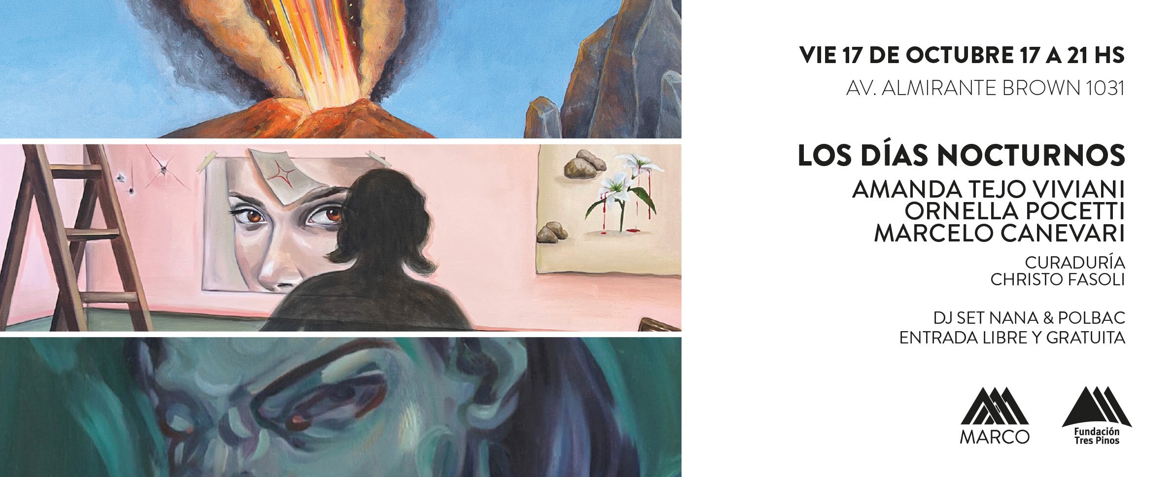 MARCO Museo de Arte Contemporáneo de La Boca y Fundación Tres Pinos invitan a la inauguración de la exposición “LOS DÍAS NOCTURNOS” de los artistas Amanda Tejo Viviani, Ornella Pocetti y Marcelo Canevari con curaduría de Christo Fasoli.