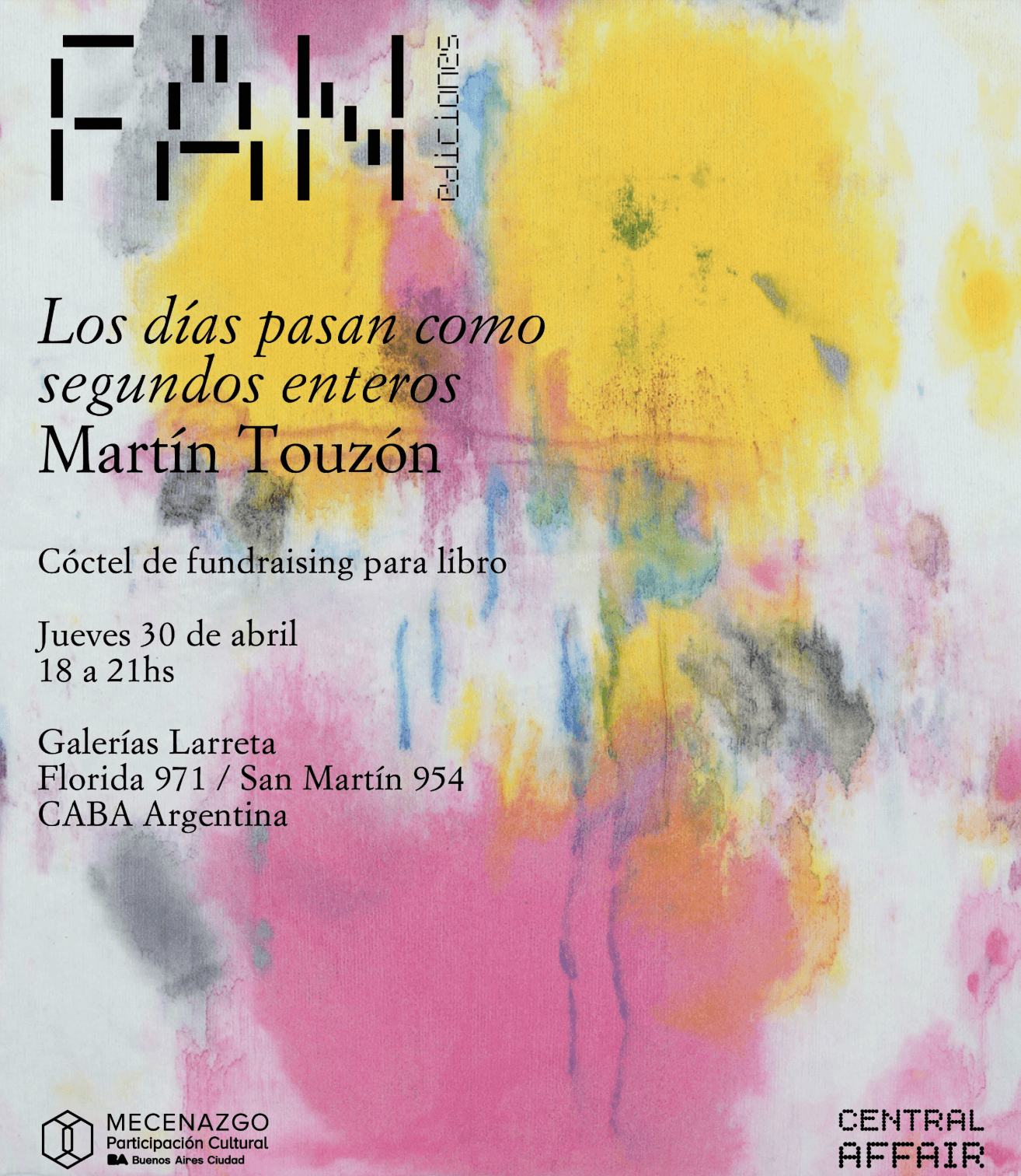 Este jueves 30 de abril inaugura la exhibición para fundraising con seis pinturas enmarcadas pertenecientes al cuerpo de obra desarrollado en el marco del libro El tiempo pasa como segundos enteros de Martín Touzón en Central Affair. Se trata de una instancia específica dentro de un proyecto mayor: la financiación de la publicación de su primer libro de artista.