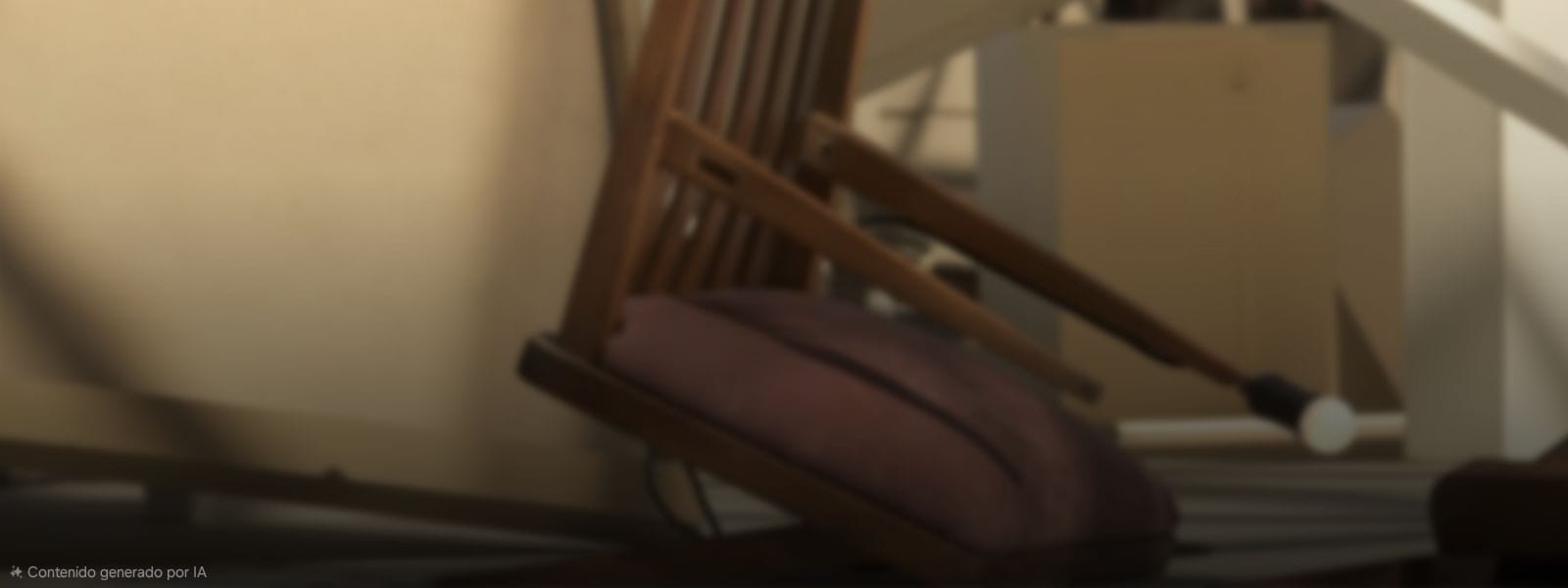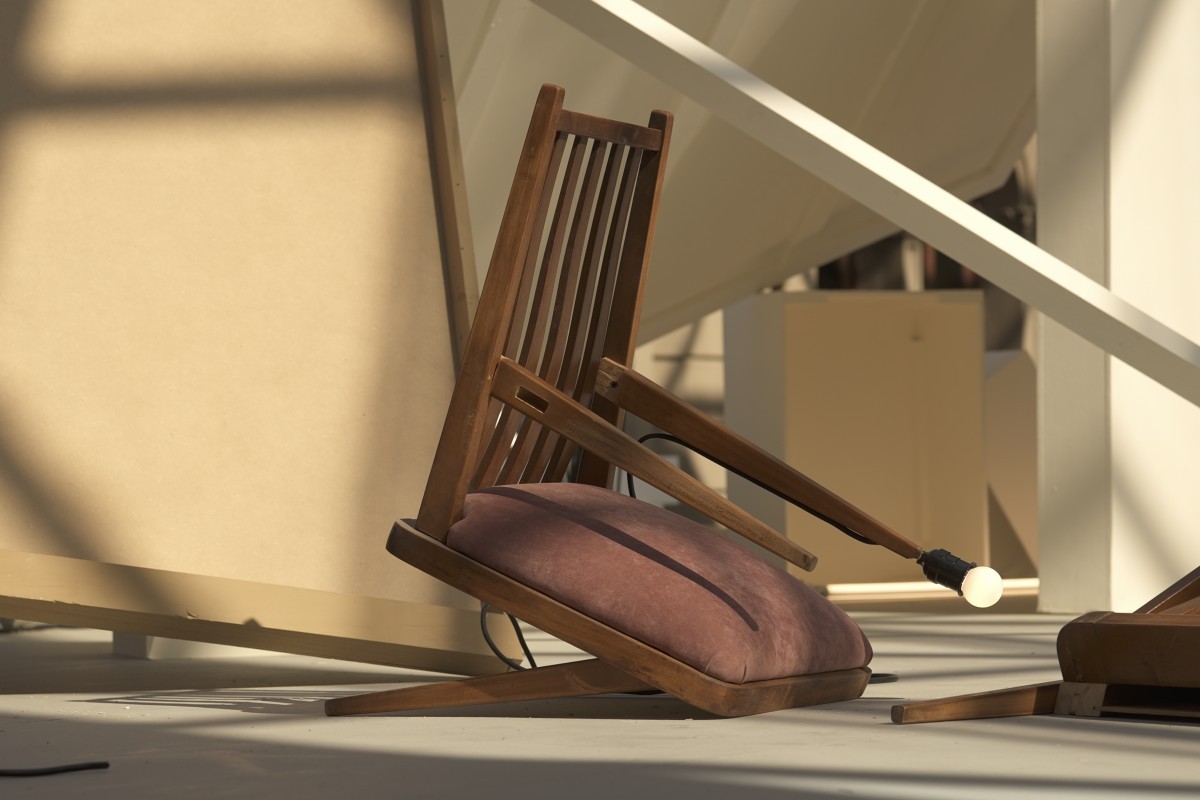 Es una arquitectura en transición, una escenografía hecha de figuras geométricas simples que colapsó. En este desbarajuste, en el punto de la desintegración de la escena, otra aparece entre sus restos. En un estado de reconversión y fragilidad, cuerpos que antes fueron sillas, acompañan la caída tomando diferentes posturas. Se sostienen entre sí, apoyan sus cabezas, apenas tocan sus manos, se abrazan; generando un clima de transformación que señala la fuerza vital del vínculo y del afecto. Un tiempo ambiguo entre el colapso y la reorganización en donde los cuerpos buscan maneras de existir y estar juntos.