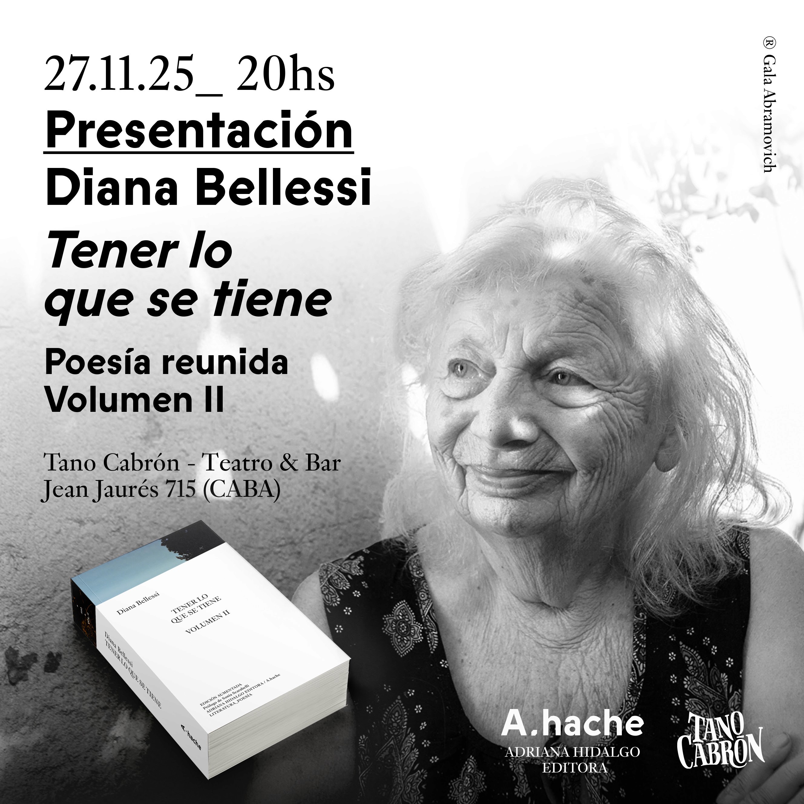 Tener lo que se tiene. Volumen II, de Diana Bellessi La semana que viene nos reunimos para celebrar a Diana Bellessi y su obra con motivo del lanzamiento del segundo volumen de Tener lo que se tiene , su poesía reunida (edición aumentada). La cita es el jueves 27 de noviembre a las 20:00 horas en Tano Cabrón Teatro & Bar (Jean Jaurés 715 - CABA). Habrá lectura de poesía, brindis y mucha alegría.