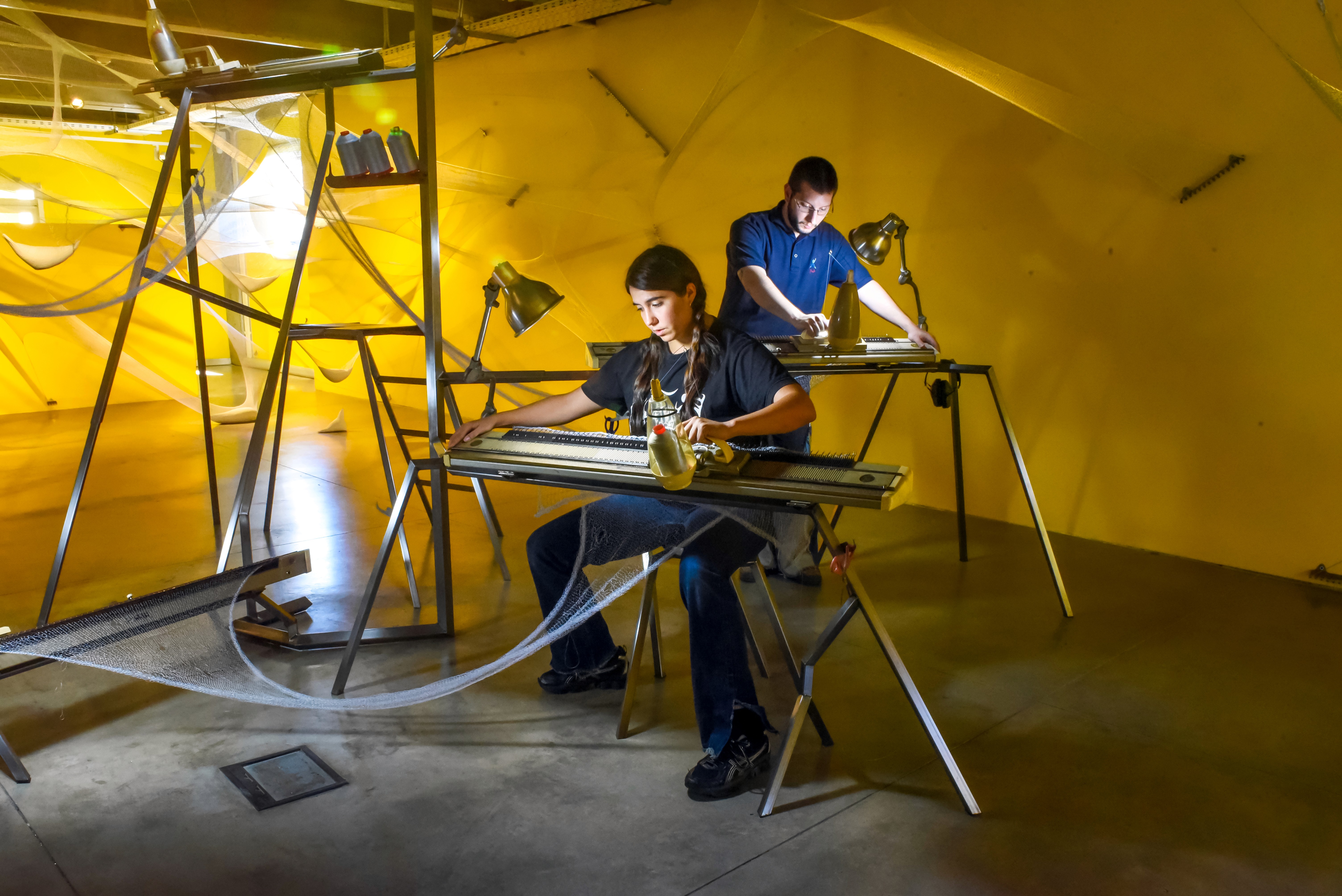 El grupo T.T.T.T. que integran Flor Sanchez Elía, Ju Ishii, Julia Hadida y Nereida exhiben TENSIÓN. La creación de una instalación en la que, como en toda su producción, se entrecruzan las artes visuales y la performance. A partir de la acción colectiva de tejer, mediante el uso de las icónicas máquinas Knittax —fabricadas en Argentina en la década del sesenta—, tricotinas de elaboración propia y materiales como tanzas y elásticos, las integrantes del grupo construyen y deconstruyen un entramado que pone en juego las nociones de colaboración, interdependencia, apoyo mutuo y reparación.