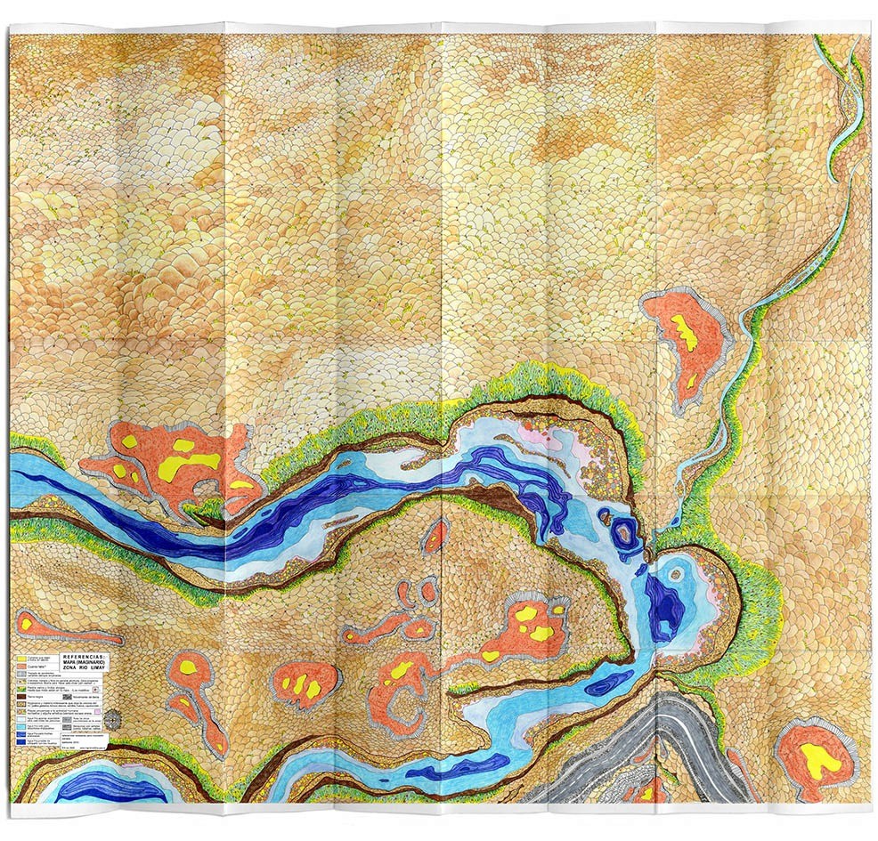 Imágen 1: Mapa (imaginario) Río Limay. Dibujo tinta, lápices y marcadores sobre papel, digitalizado e impreso sobre papel city light con tintas con filtro UV. Medidas: 121,5 x 132 cm. Copia 3/7. De Ingrid Roddick, 2010