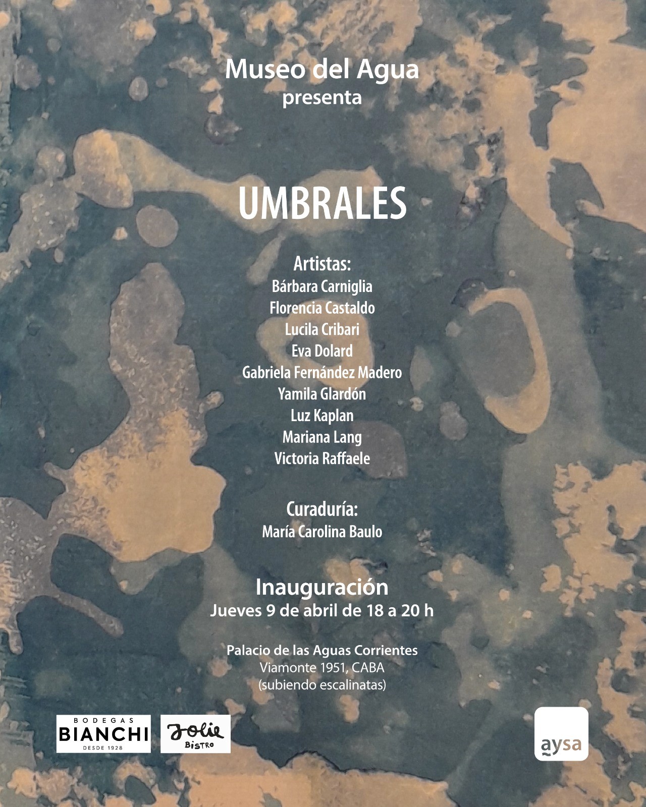 Bárbara Carniglia, Florencia Castaldo, Lucila Cribari, Eva Dolard, Gabriela Fernández Madero, Yamila Glardón, Luz Kaplan, Mariana Lang y Victoria Raffaele presentan nueve instalaciones de carácter sitio específico. Habitando el espacio de los tanques del Palacio de las Aguas Corrientes, cada una genera piezas que funcionan individualmente y se potencian en conjunto, proponiendo un recorrido donde el espectador transita distintas experiencias en diálogo con la arquitectura del espacio.