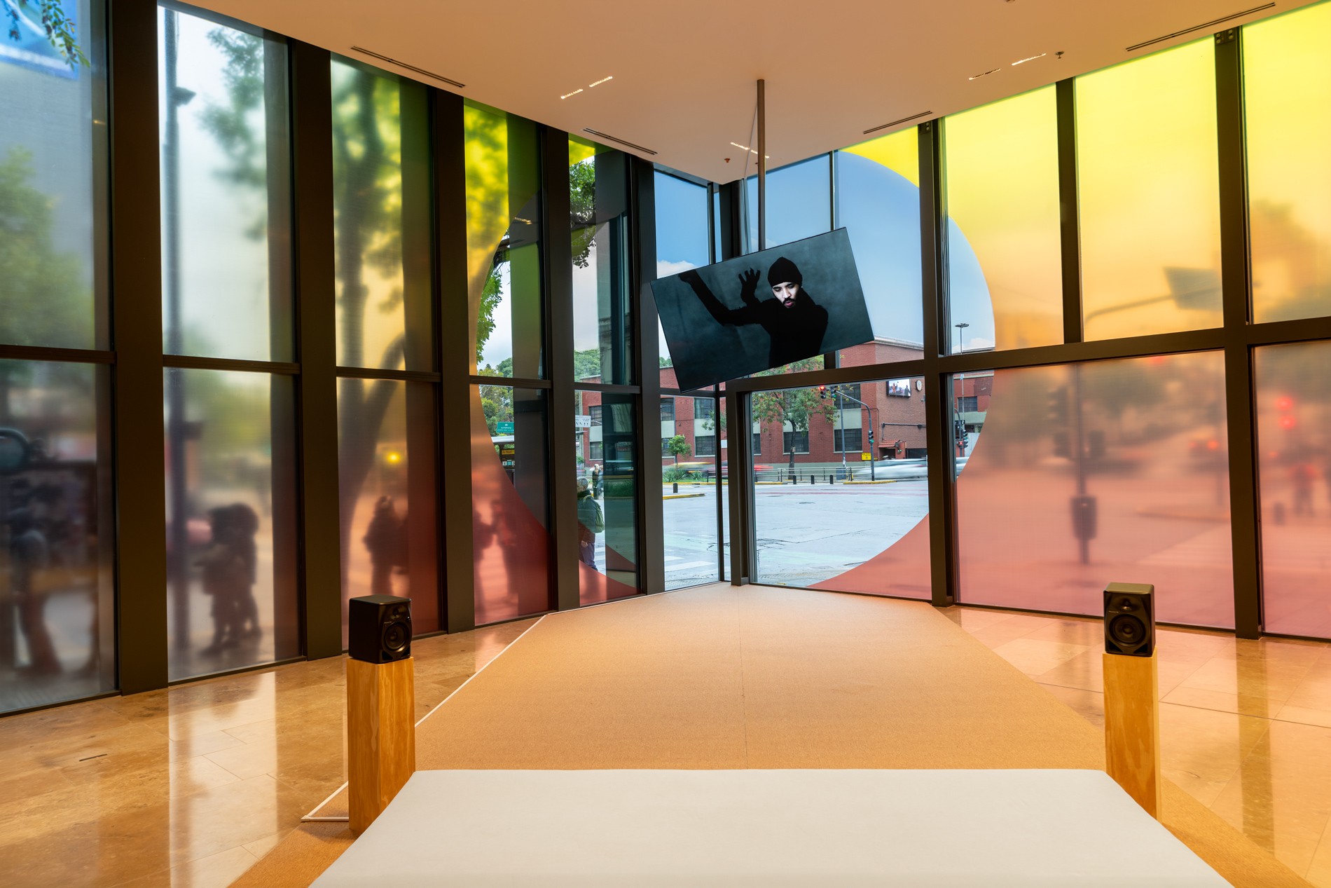 ReversoDoble abraza la arquitectura en un atardecer interminable. Construye un ambiente envolvente a partir de imágenes, texturas, sonidos y colores que activan sensaciones en el cuerpo de quienes lo recorren. El gran ventanal, que limita el interior del exterior, se vuelve un portal; permite ver la ciudad y a quienes van de paso, espiar adentro. Ahora bien, ¿quién mira del derecho y quién del revés?