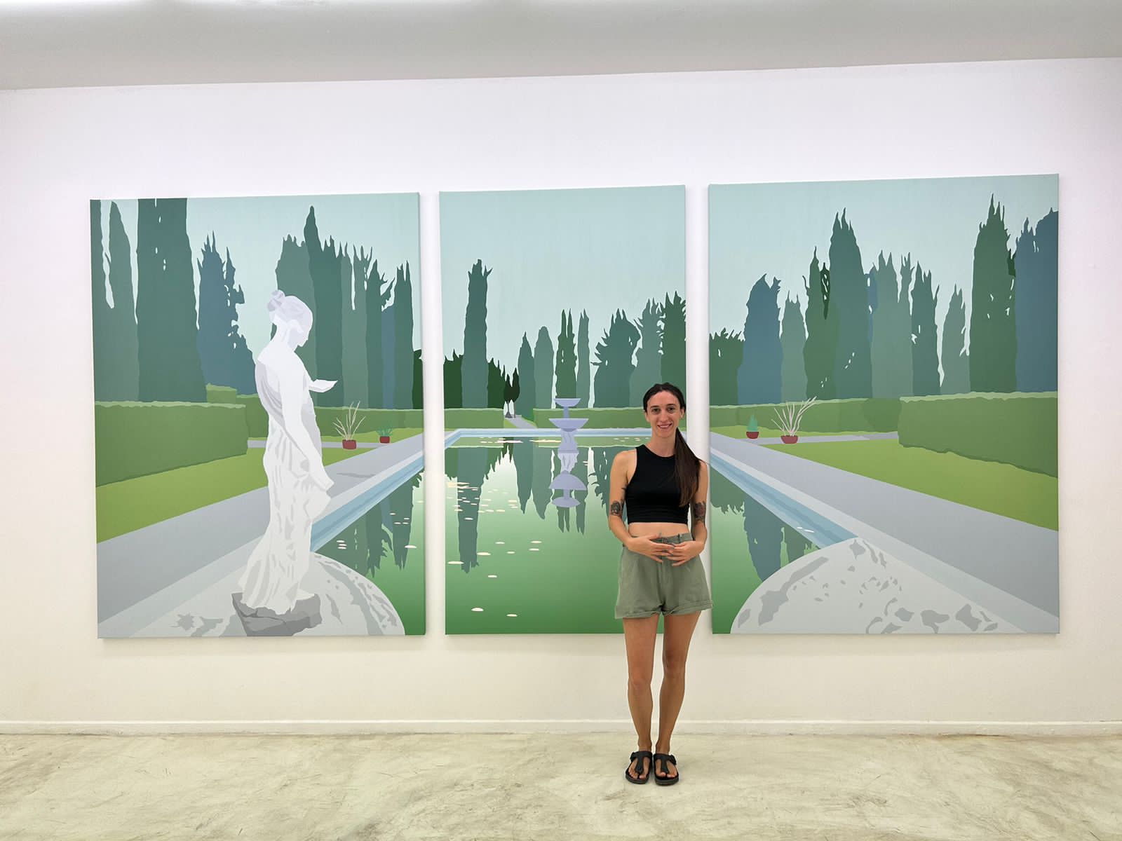 Su producción se basa en la representación de parques y jardines que escapan al acelerado ritmo de la vida moderna. Espacios cerrados que se abren, propician la abstracción del pensamiento, un recreo visual, el anhelado ocio. Su pincelada impersonal, finas capas de pintura una al lado de la otra, sin superponerse, componen formas orgánicas y sintéticas. Así, materializa paisajes emocionales que transitan entre lo terrenal y lo onírico, introduce a quién observa en una atmósfera de contemplación y misterio y, a su vez, a cruzar la delgada línea entre lo real y lo imaginario.